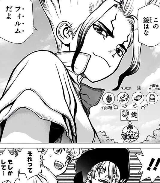 フランソワを復活させた代わりに、女記者の南はカメラを要求します。千空は鏡をフィルム代わりにし、銀板写真(ダゲレオタイプ)を作成します。さらに千空と龍水は、作成したカメラを利用して、空から航空写真を撮り油田を見つけようとします。