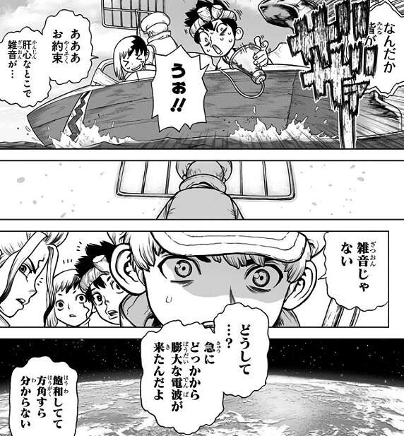 スイカとフランソワが使っていたイノシシのおかげで、相良油田を発見することが出来、千空は無事、油田からガソリンを作ることに成功します。モーターボートで早速、オイルテストを行い、作ったガソリンが超高品質であることを確認できましたが、そのオイルテスト中に謎の膨大な電波を受信します。