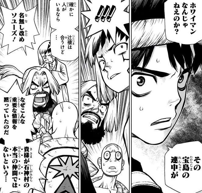 自分の本当の名前を「ソユーズ」と名乗る村人が現れ、千空は宝島には人間がいると推測します。その「ソユーズ」と名乗る村人は石神村の遠縁の人間で、日本を目指さず宝島に残った住民ではないかとさらに推測します。さらに宝島に残った住民がホワイマンの可能性もあり、千空達は偶然訪れた嵐に紛れて宝島に接近することにします。
