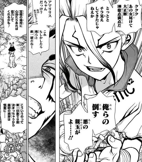 アマリリスは幼い頃に友人を石化されていて、石化武器を頭首から盗ろうと考えていました。また頭首には石化能力がなく、党首の側近キリサメが石化武器を使って島の住民を石化している事も、千空はアマリリスから聞かされます。アマリリスから石化武器について聞かされ、石化武器には効果範囲があるなどルールがあり、ルールがあるなら科学だ、科学で闘えんなら負けねえよ、と千空は断言します。