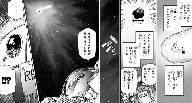 1年かけて彗星と出会える場所まで向かい、彗星 本体の核を持って帰ろうとします。しかし、レイが計算した核は100mくらい、重さは50万トンぐらいでしたが、実際の彗星の核は400mの、重さは1,500万トンと予想以上に大きく、このままでは彗星の核を持ってけることは出来なさそうです。