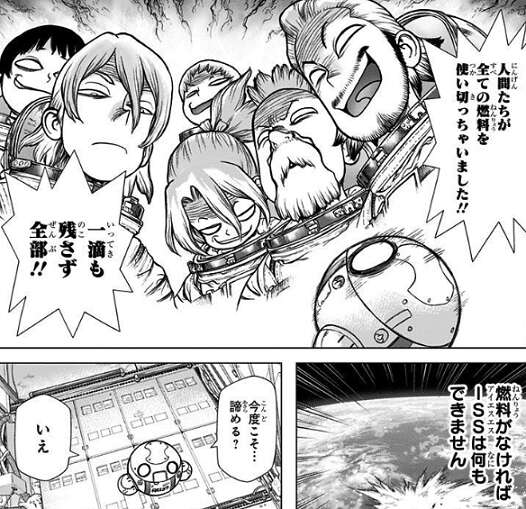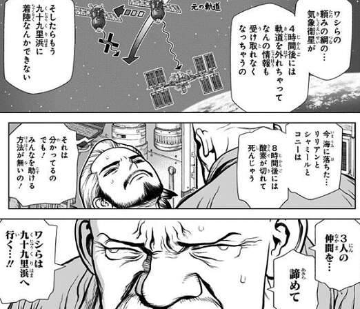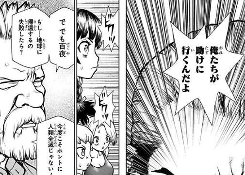 そして地球上の全人類が石化した日、百夜はISSにいて石化から難を逃れます。百夜はISSにいた五人に、全人類を助けに行こうと言いますが、ヤコフから、もし…地球に帰還するのに失敗したら?今度こそホントに人類絶滅じゃない!と地球帰還に反対されます。