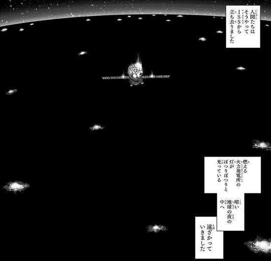 百夜のロボット「レイ」を使って大気圏密度も計算しズレをなくそうとしますが、地球では電気も無くなっているようで、大気圏密度を計算しようにもネットから肝心の気象データが受け取れず計算が出来ません。6人が窓から地球を見ると、そこには大都市の東京やロサンゼルスでさえ、灯りがほとんどない地球が見えました。
