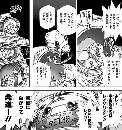 前半は、千空の父親 百夜がISSから地球へどうやって帰還したかの経緯が描かれていて、後半はISSに残ったロボット レイのその後が描かれています。