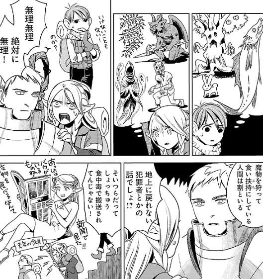 ダンジョンに潜って魔物食ばかりを口にしていたマルシルは、夢に出まで魔物食が出て来てしまいお疲れ気味です。他のパーティーが塩漬け豚を炙って食べているのを見てマルシルが羨ましがっていると、センシがそれは体が脂を欲しがっているせいだと言い、今日の獲物は脂分が豊富な魔物に決定します。
