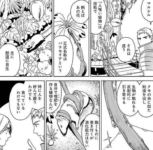第2階層の尖塔の森に着いたライオス一行は、マルシルに疲れが出たこともあり、野営地を決めて今日は早めに休むことにします。当然食事は現地調達となりますが、マルシルの希望を聞いた結果、木の実や果実の食材にする事になります。木の実や果実を知っているセンシに教えてもらった結果、人喰い植物を食べる事になりました。