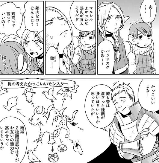 さらに完全栄養食の卵も獲ろうとし、その結果獲物は蛇の王、バジリスクに決定します。一応、バジリスクは鶏肉っぽいのですが、マルシルはそれを鶏肉と言っていいのか悩みます。