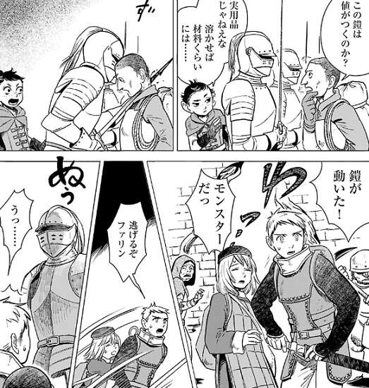 チルチャックの鍵開けの道具としてライオスの剣を使用していると、鍔のところの細工が取れてしまいます。ライオスの剣はライオスがまだ駆け出しだった頃から使っていた剣で、剣の思い出話からライオスの初めての死亡は、動く鎧だったという話になります。はじめて殺されたのが動く鎧だったので、ライオスは動く鎧の事をたくさん調べましたが、どの文献にも動く鎧の味の事までは書いてありませんでした。