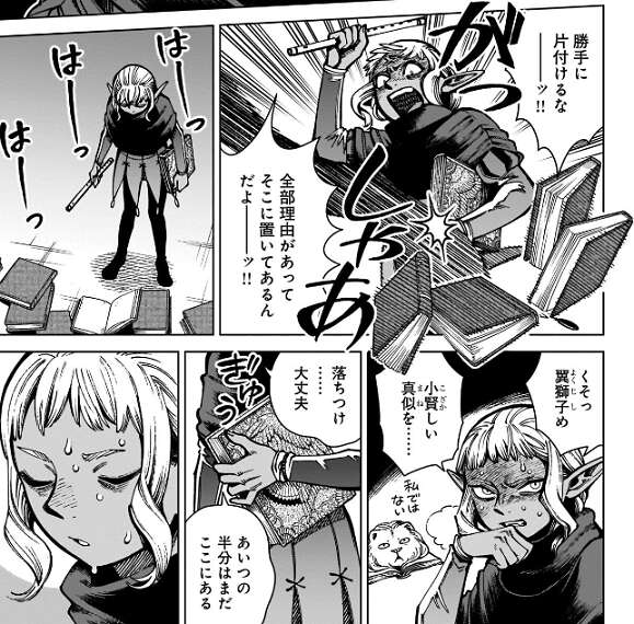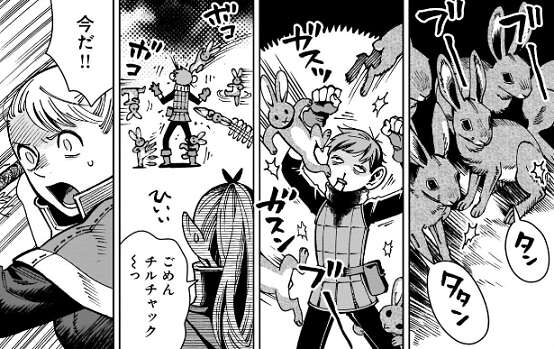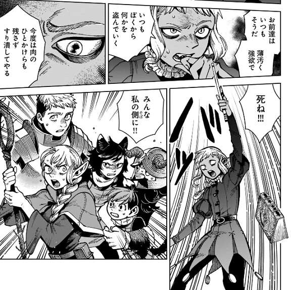 ライオス、センシ、チルチャックが殺され、イヅツミとははぐれたマルシルは、一人で迷宮の兎に立ち向かい事になります。しかし、マルシルが戦っても大怪我をしてしまうのでしかたなく、マルシルは魔術でチルチャックの身体を動かすことにします。死体を魔術で動かすネクロマンシーは犯罪と分かっていますが、今は仕方ないとマルシルは自分に言い聞かせ、チルチャックを迷宮の兎に突っ込ませます。