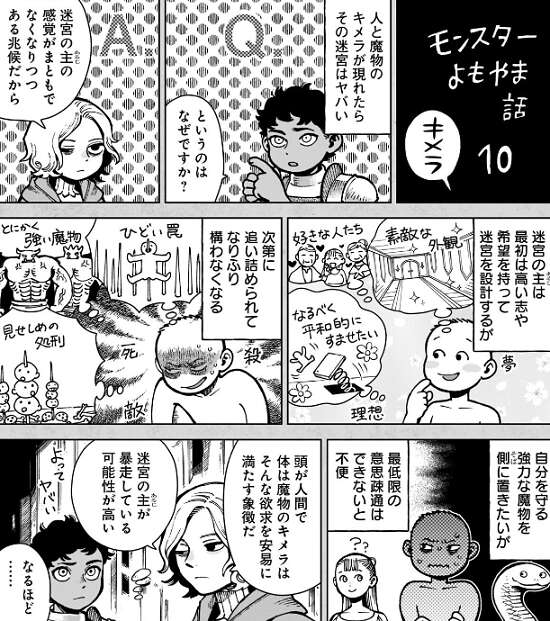 人と魔物のキメラが現れたらその迷宮はヤバい、という質問にミスルンが答えています。迷宮の主は最初は高い志や、希望を持って迷宮を設計します。しかし、次第に追い詰められてなりふり構わくなってきて、キメラに手を出すようです。