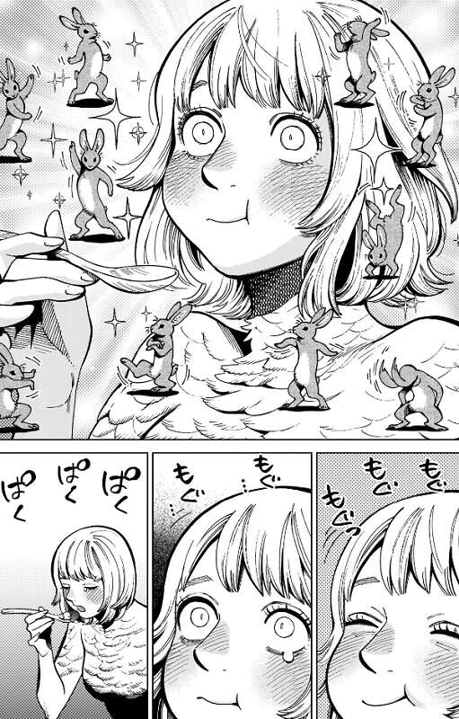 ライオス達はなんとか、迷宮の兎を食材として確保しますが、迷宮の入り口ではタンス達と上陸したエルフの軍隊とが言い争いをしていました。さらに第6階層のカブルーとカナリア隊は迷宮を偵察しますが、ライオス達を見つけられないでいました。ミスルンは近くに悪魔の気配を感じ、部下に命じて道を作らせてさらに迷宮の奥に進もうとします。しかしその様子を、狂乱の魔術師が操る魔物が監視していました。