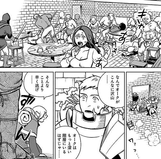 オークのよもや話では、トールマン(人間)やオークの美醜の感覚の違いの話題になります。オークから美醜の感覚が随分違うから、ライオスから見たらオークである自分達は醜く見えるのかと聞かれます。ライオスは多分基準はそんなに違わないと思うと言い、オークの奥さんの綺麗な所や、体の素晴らしい所を語りますが、他種族にも興味津々なライオスの性格が災いしオークを激怒させてしまいます。
