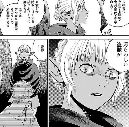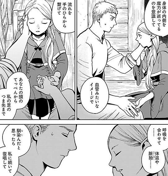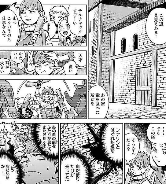 今後の為にもライオスに治療や防御魔法を使えるようになって欲しいと、マルシルは魔術をライオスに教えます。ファリンの兄だけあって素質があるのか、すぐにマルシルの耳の傷の治療に成功しますが、チルチャックはあまり嬉しそうではありません。リーダーであるライオスには人を繋ぎとめる能力、魔術よりも社交術や人を見る目を養って欲しいチルチャックとしては、マルシルと意見が対立します。