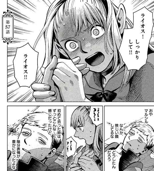 物語は有翼の獅子にライオスが導かれ始めていますが、ミスルンの過去話を見ると、ライオスの望みを叶え更なる欲望を悪魔が引き出し始めているとも、受け取れるような気がします。第60話を見ると、有翼の獅子はマルシルにも目をつけているようにも見えますが、今後の展開が気になります。