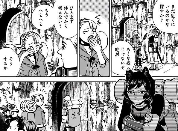 有翼の獅子を探して迷宮の先へ進んでいると、夜営跡が見つかります。ライオスは最奥の扉の前で見た夜営跡と似ていると思い、近くに誰かいないか探そうとしますが、マルシルはもうへとへと、と言いひとまず休もうと提案します。各々が休む準備をしようとしますが、イヅツミはライオス達の歩みが遅くこの調子ではいつ迷宮の底に辿り着くんだ?と不満を口にします。