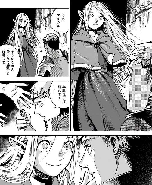 場面は少し戻り、サキュバスが牛乳を飲むのか試そうと、ライオスが皆と分かれて不用意に単独行動をしたところから始まります。牛乳を取りに来ますがもう残っておらずがっかりしていると、マルシルが現れてライオスを誘惑してきます。ライオスはマルシルでないと直感し、マルシルの姿をしたサキュバスだと思い攻撃しようとします。