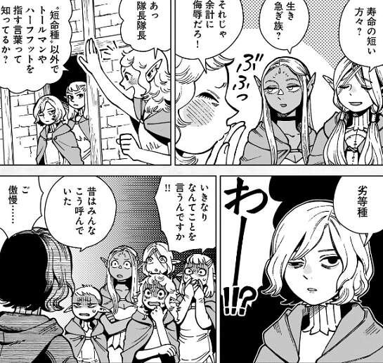 エルフはトールマンなどを短命種と呼びますが、近頃では短命種は差別語になるそうです。他の呼び方をミスルン隊長に聞きますが、昔の方がもっと侮辱的な呼び方でした。この呼び方には、カナリア隊の面々もドン引きしています。
