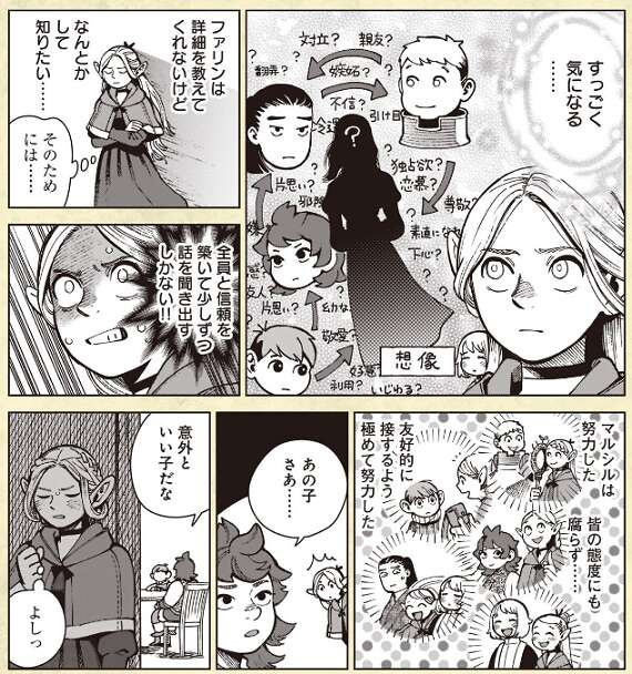マルシルは嫌な気分になるのかと思いきや、どんな内容だったのか興味津々で何としてでも話を聞き出そうと、友好的に接して信頼を勝ち取ります。結局、話の全容は大したことはありませんでしたが、ライオスの信頼回復に一役買っていました。