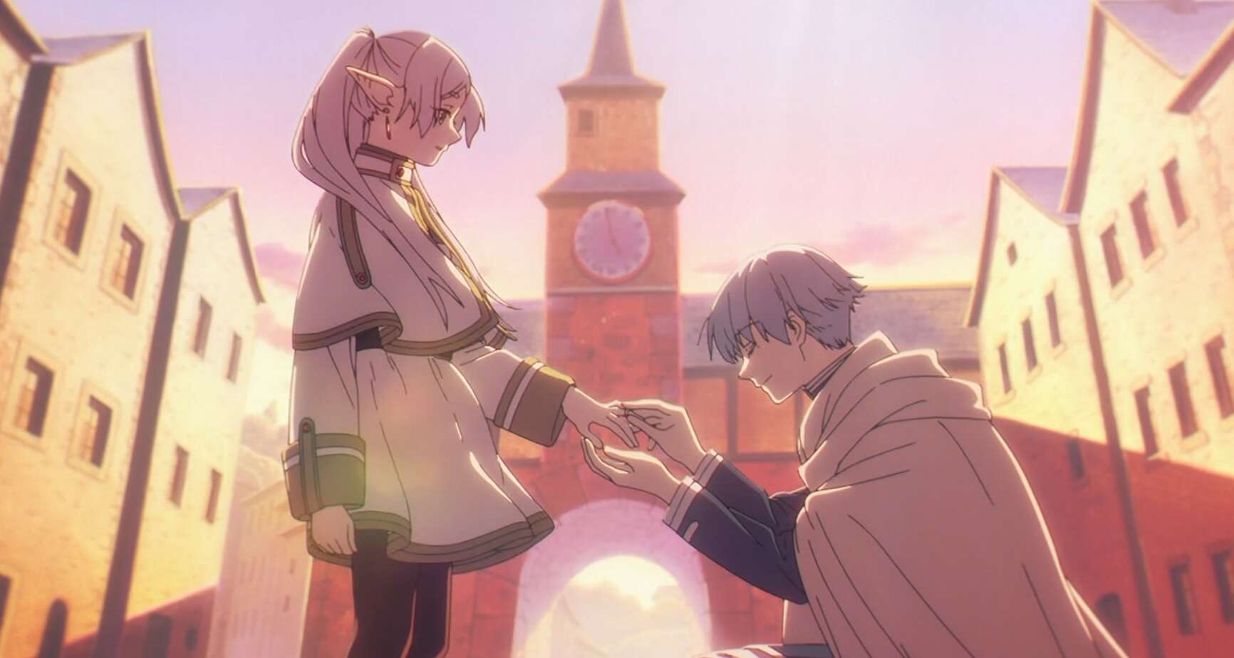 冒頭、ヒンメルがフリーレンを買い物に誘っていましたが、この後、フリーレンに指輪をはめてあげて指輪をプレゼントしたのだと思います。しかし、ヒンメルがフリーレンの指に指輪をはめるシーンですが、原作以上に恋人にはめるような感じになっていますね。アニメで見たらヒンメルは多分、鏡蓮華の花言葉や意味を知っているような感じに見えましたし、ヒンメルはフリーレンに恋心を抱いているように感じますね。