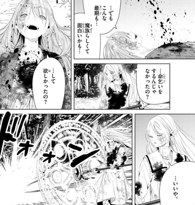 ソリテールは自分が取り返しのつかない油断をしたことに、…まさか私が…、と悔やみつつも、…でもこんな最後も…、魔族らしくて面白いかも…、と諦めた表情を見せます。フリーレンから、命乞いをするんじゃなかったの?と、聞かれて、…して欲しかったの?と、ソリテールは答えます。フリーレンは、…いいや、と言うと、ソリテールに止めを刺し、ソリテールは消えていきます。