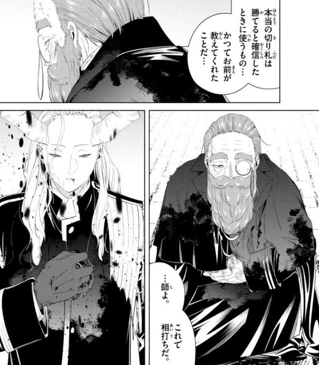 本当の切り札は勝てると確信した時に使うもの…、かつてお前が教えてくれたことだ…、とデンケンはマハトに言った後、デンケンは最初から相打ちを狙っていたようで、これで相打ちだ、とマハトに告げます。