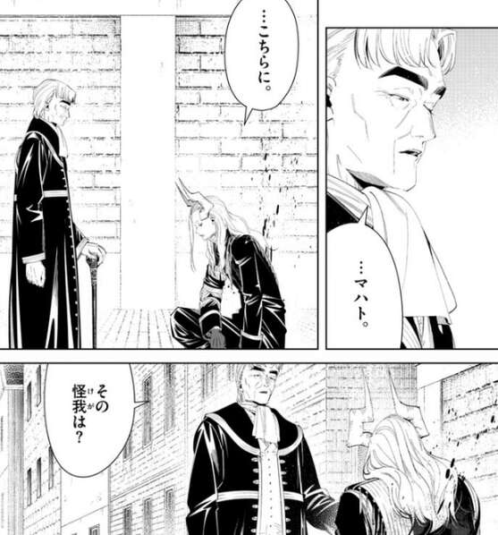 グリュックに、その怪我は?と、質問されて、…どうやら私も報いを受けるときが来たようです…、とマハトは答えます。