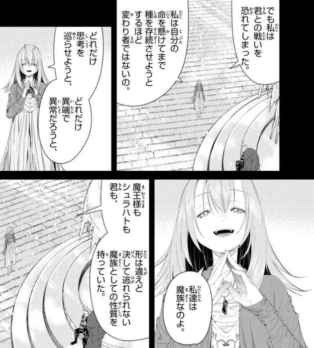 この場で俺を殺した方が、考えを改めさせるよりずっと早い、とマハトが言うと、きっと君を友達と重ねてしまったのね、私は魔王様を止められなかったから、とソリテールは意味深な事を言った後、嘘だと言いなおします。本当はマハトを殺すつもりでこの地を訪れた、とソリテールは言い、でもマハトとの戦いを恐れてしまった、自分の命を懸けてまで種を存続させるほど変わり者ではない、とマハトを殺さなかった理由をソリテールは教えます。どれだけ異端で異常だろうと、私達は魔族なのよ、とソリテールは言い、魔王もシュラハトもマハトも、形は違えど決して逃れられない魔族の性質を持っていた、とマハトに指摘します。