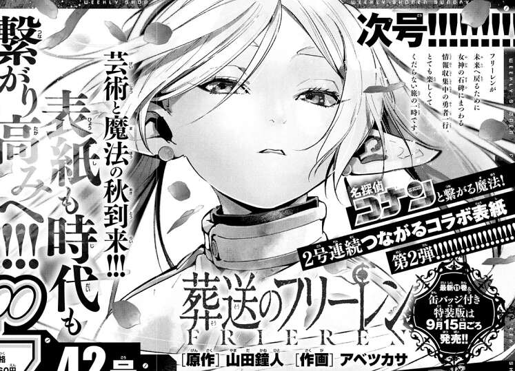 第42号は葬送のフリーレンが表紙です。今号と繋げると、コナンと「つながるコラボ表紙」になります。