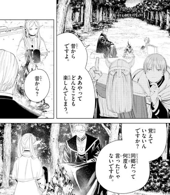 ハイターは、昔からヒンメルはああやってどんなことも楽しんでしまう、とフリーレンに言いますが、フリーレンは初耳のように聞き返します。ハイターとヒンメルが同郷だというのはフリーレンに何度も教えているようですが、フリーレンは覚えていないようです。しかし、それもフリーレンらしいですね、ハイターは言い、もう一度ハイターとヒンメルの子供の頃の話をフリーレンに教えます。