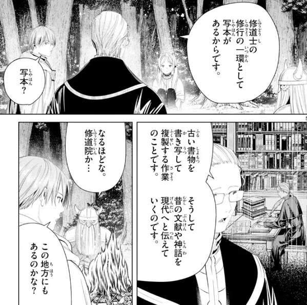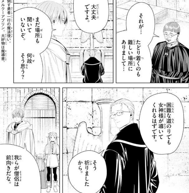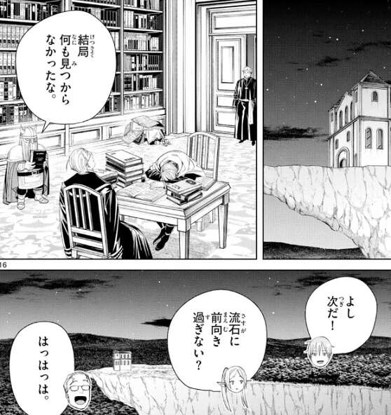 文献でも残っていれば女神の石碑を解読する手掛かりになるかもしれませんが、そういう情報も村ではなかったようです。フリーレンが、紙は寿命が短いから、管理が甘いとすぐに腐って読めなくなる、と愚痴っています。エルフの時間感覚では紙の寿命短いようで、フリーレンも貴重な魔導書を何度か失っているようです。しかし、アイゼンやハイターの時間感覚ではそんなことはなく、本が腐るのが日常だなんてエルフ恐るべし…、とハイターがつぶやいています。