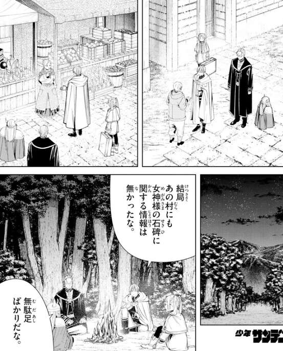 今週はフリーレンが未来に戻る為、女神の石碑に関して村で情報収集をしていますが、無駄足だったようで何も情報をありませんでした。ハイターいわく、女神の石碑自体が神話の時代の産物のようで、情報がなくてもおかしくないようです。