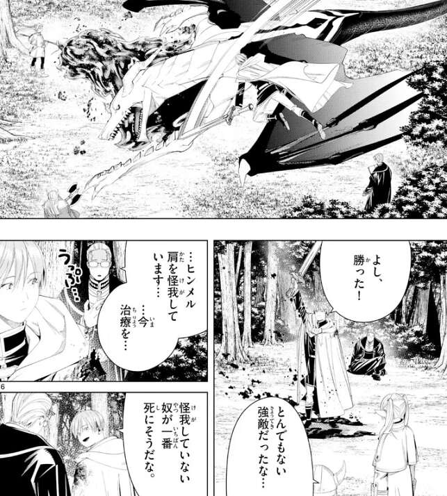 ヒンメル達は皇獄竜に苦戦しながらも、何とか勝利します。ハイターはヒンメルの怪我を魔法で治療しようとしますが、怪我をしていないハイターが一番死にそうになっています。