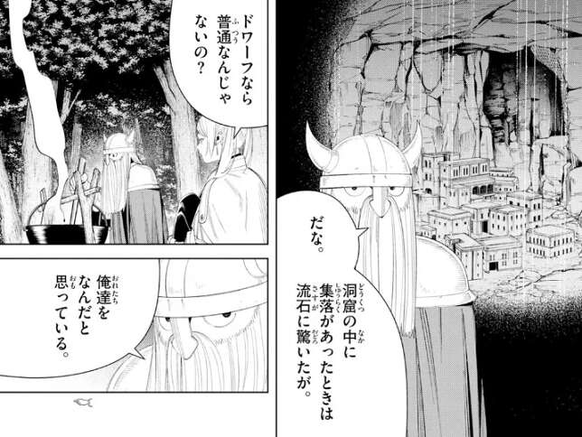 北部高原の集落は魔物の脅威から自衛するために、複雑で入り組んだ地形にあることが多く、集落に辿り着くだけ体力がいることが多いようです。今まで立ち寄った集落も、崖の上に遭ったり、峡谷の底に遭ったり、大きな湖の孤島に集落があったりと大変だったようです。洞窟の中に集落があったこともあるようですが、ドワーフなら洞窟の中に集落があっても普通なんじゃないの?と、フリーレンはアイゼンに尋ねます。
