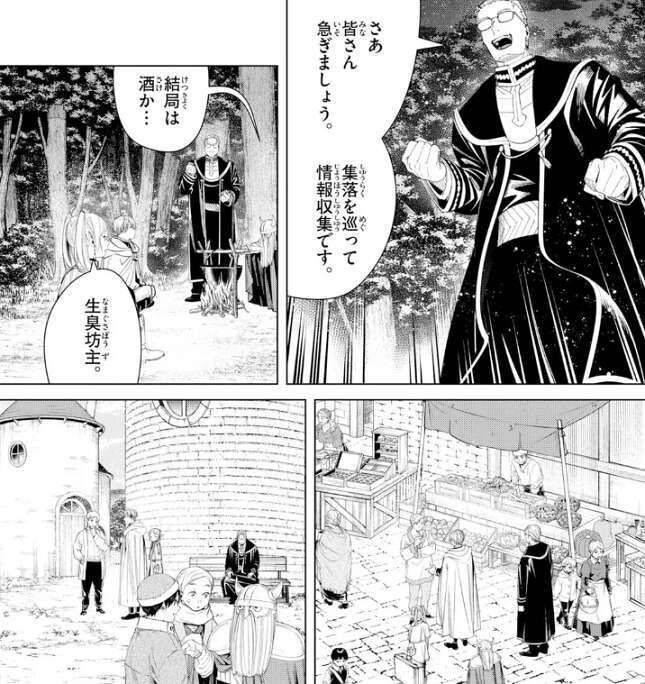 ドワーフは鉱夫や鍛冶で生計を立てている者が多いので、洞窟の中に集落があっても普通そうですが、日の光を浴びなければ目覚めも悪いようで、流石に住むのは地表が普通だそうです。ハイターが集落を巡るのは大変だと言っていると、ヒンメルが、集落をめぐる分だけその土地の地酒が楽しめるぞ、とハイターを元気付けます。