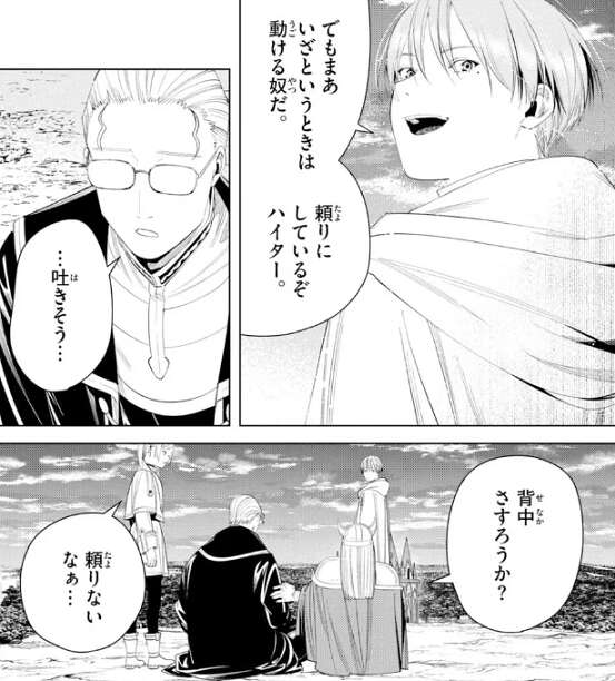 その遺跡へと行きますが、ハイターは酒を飲み過ぎたようで既に吐きそうになっています。ヒンメルは、いざというときは動ける奴だ、頼りにしているぞハイター、とハイターを評価しますが、ハイターは吐きそうになっていて動けそうにありません。アイゼンはハイターに、背中をさすろうか?と、気を遣いますが、そんな様子を見て、頼りないなぁ…、とフリーレンは愚痴をこぼします。ヒンメルはフリーレンに魔力探知の結果を聞きますが、鐘楼の所に竜がいてフリーレンは魔力探知するまでもないと言います。