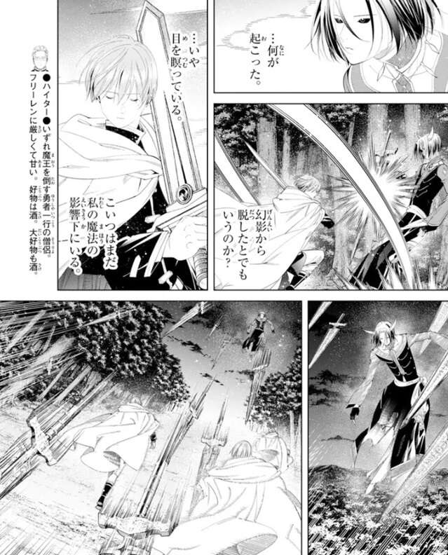 ハイターはグラオザームとソリテールの同時攻撃にさらされ、さらにヒンメルとフリーレンを守りながら戦っています。グラオザームの幻影に捕らわれているヒンメルですが、誓いのキスをする段階になって、フリーレンに打開策を聞いています。ヒンメルはグラオザームの幻影には気づいているようですが、まだ幻影の中からは抜け出せていないようです。