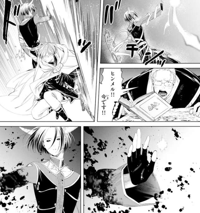 しかし、グラオザームの魔法はハイターが魔法で防ぎ、ヒンメルが剣でグラオザームの腕を斬り落とします。
