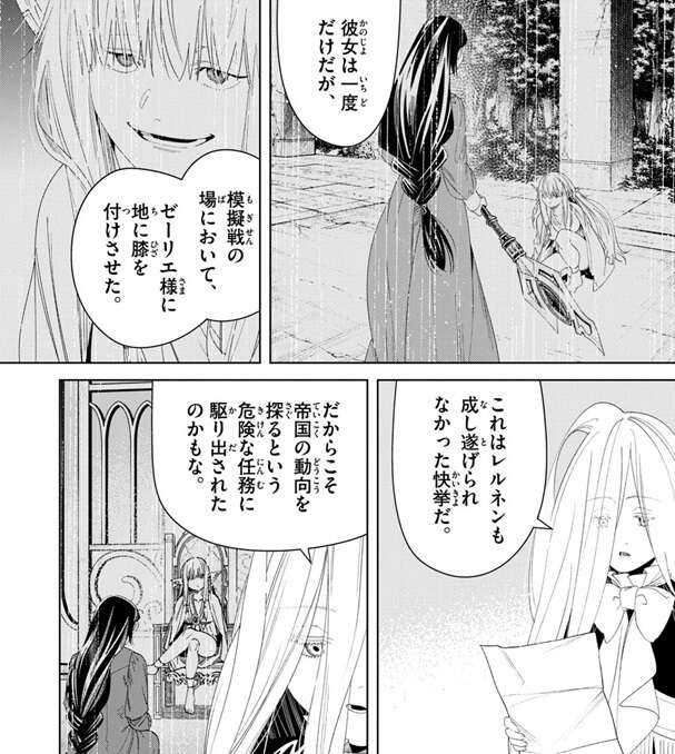 リネアールは恐ろしい程に優秀な魔法使いのようで、一度だけですが模擬戦の場においてゼーリエに地に膝を付けさせたこともあるようです。これはレルネンも成し遂げられなかった快挙で、だからこそ帝国の動向を探るという危険な任務にリネアールは駆り出されたのかもな、とゼンゼはつぶやきます。対人戦という一点において、リネアール程優秀な人間の魔法使いを私は知らない、とゼンゼはリネアールを評価します。