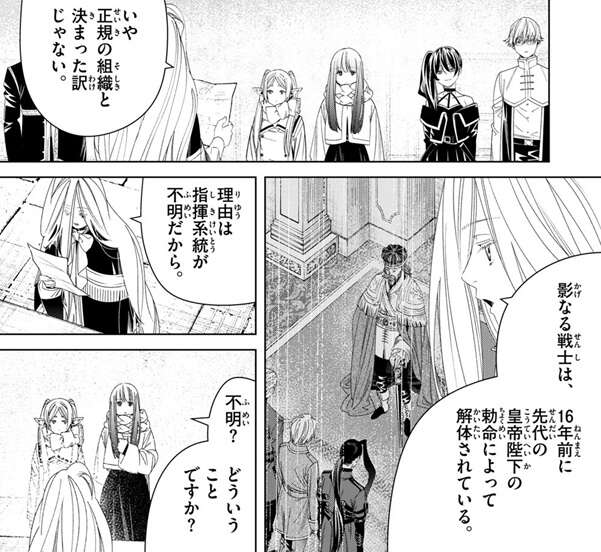 一方、リネアールが収集した情報が書かれた文章を確認したゼンゼは、敵の正体が影なる戦士だと確認します。影なる戦士は暗殺に特化した帝国の特務機関で、帝国の正規の組織だからフリーレンは相当まずいと言います。下手をすれば帝国そのものを敵に回すことになる、慎重に動くべきだとラントは言いますが、フェルンが影なる戦士を既に一人ぶっ飛ばしちゃったけどね、とフリーレンがぼそっとつぶやきます。さらにユーベルとラントは魔導特務隊と派手にやり合っているので、帝国への印象はかなり悪いかもしれません。しかし、ゼンゼは影なる戦士は16年前に先代の皇帝陛下の勅命によって解体されているので、正規の組織と決まったわけではないと言います。解体の理由は指揮系統が不明だからで、影なる戦士は通常の軍隊とは真逆で、現場の指揮官に大きな権限が与えれた組織だったようです。上の命令無しに各指揮官が勝手に動く軍隊だったようで、フェルンはなんでそんな仕組みになっているか疑問を口にしますが、フリーレンは強いからでしょとそんな仕組みになった理由を推測します。