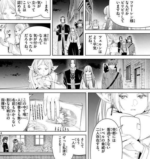 シュタルクはこの人相書きだけで影なる戦士を探すのか?とフリーレンに聞き、舞踏会は明日なんだからそれまで潜伏してるんじゃねぇか、とシュタルクは言いますが、フリーレンは、指示を出したゼンゼに言うべきだね、と答えます。ロレの魔力探知も市街戦の後は引っかからないようで、さらにフェルンは追跡しようとしたようですが魔導特務隊の邪魔が入ったようで、フェルンも魔力探知は出来ていません。
