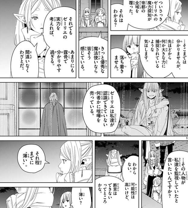もう一人は帝都のすべての事象を監視している何者かのようで、ついさっきゼーリエの魔力探知が帝都の全域を覆った事をフェルンに教えます。ゼーリエはフリーレン達には認識できない何者かに喧嘩を売っているようです。フリーレンにとっても魔力探知するにはかなり相手の魔力は“薄い”ようです。