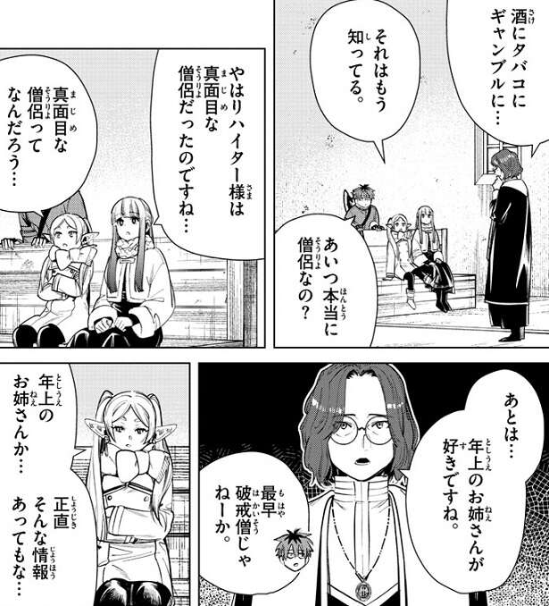 ザインの勧誘に苦戦するフリーレン達は、兄の神父にザインの好きなもの聞きます。ザインの好きなものは、酒、タバコ、ギャンブル、と僧侶に似合わないものばかりです。フェルンは、ザインと比べてハイターが真面目な僧侶だったと、改めて気付いたようです。しかし、フリーレンは真面目な僧侶がハイターという所に、納得がいきません。あとは年上の女性という事で、フリーレンはある子に気づきます。