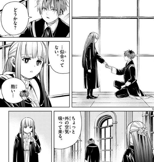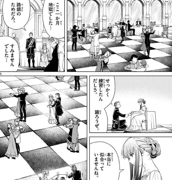 ガーベルから貴族の作法を朝から夜まで叩き込まれて、シュタルクはフラフラです。フェルンから作法の練習はどうですか?と聞かれて、シュタルクはフェルンの手をにぎってみせますが、似合っていないとフェルンからは言われてしまいます。ショックを受けたシュタルクは外の空気を吸いに行きますが、残されたフェルンはにぎられた手を見つめています。
