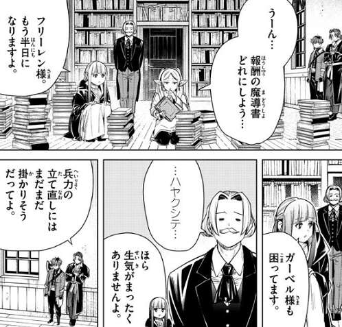 翌日、フリーレンは報酬の魔導書をどれにしようかと、半日迷っていました。フェルンから、ガーベル様も困っています、と言われガーベルからも、…ハヤクシテ…、と言われます。ザインはフリーレンが魔導書を選ぶのを眺めながら、兵力の立て直しにはまだまだ掛かりそうだってよ、とシュタルクに話します。それを聞いたシュタルクは、少なくとも後継ぎには困らなそうだ、とザインに答えます。