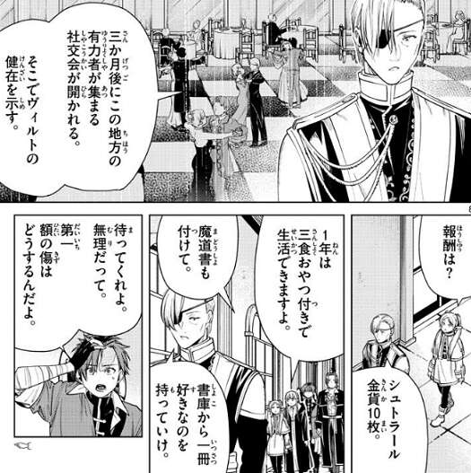 今回、シュタルクが貴族の息子に似ている事から、その息子の替え玉として社交界に出席させられる事になります。フリーレンも最初は依頼を受ける気はなかったのですが、手持ちの路銀が残り少ないと分かると、途端に乗り気になっています。