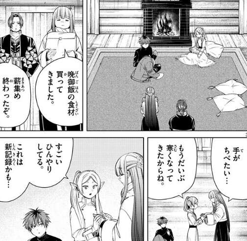 ザインの親友、戦士ゴリラの行先がテューアと分かりますが、フリーレン達の目的地オイサーストとは別方向と分かり、ザインは考え込みます。とりあえず日も暮れそうですし、結論は明日でもいいんじゃないですか?とフェルンが言うので、ザインは結論を出さず今夜は集落の小屋に泊まることにします。ザインが薪集めを行い、フェルンが晩御飯の食材を買ってきますが、フェルンの手が冷たくなってしまいます。フリーレンがフェルンの手を取って、すごいひんやりしてる、これは新記録かも…、と言うと、シュタルクもフェルンの手を取ります。