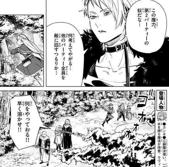 試験区域を囲むように張られている結界が水を通さないせいで、ほとんどの川が枯れているようです。水のほとんどは湖に集まっているようで、水場に集まる隕鉄鳥を狙って最大の水場である湖の周りに受験者が集まっていると、ラントは予想します。ラントは不要な戦いを避けるため、水を諦めようとしますが、他の受験者に見つかってしまいます。
