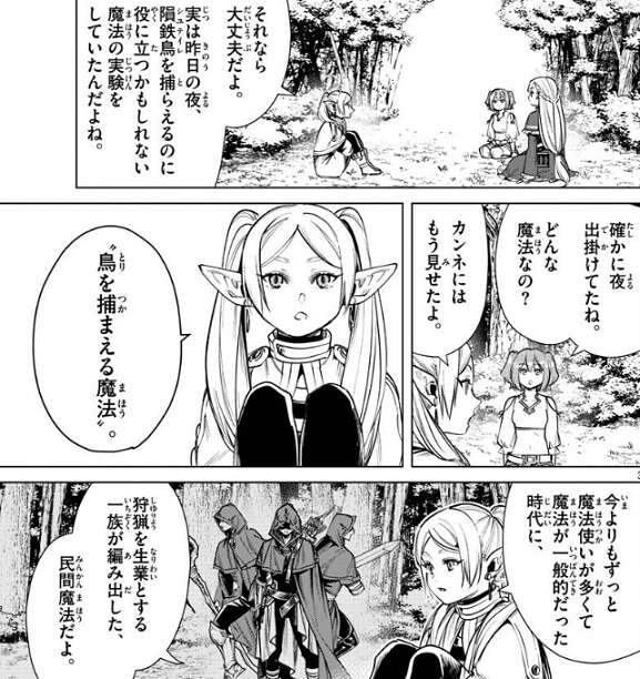フリーレン達は、今まで隕鉄鳥を観察した結果を話し合っています。カンネは、隕鉄鳥は音速を超えて飛行するので追いつくのは不可能、さらに竜みたいに頑丈なので拘束も破られる、と観察した結果を話します。ラヴィーネは、隕鉄鳥は魔力にとても敏感で魔力を抑えていても、近づくとすぐに逃げられると話します。さらに隕鉄鳥が魔力をほとんど持っていないので、隕鉄鳥に対して魔力探知が出来ない、と話します。