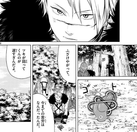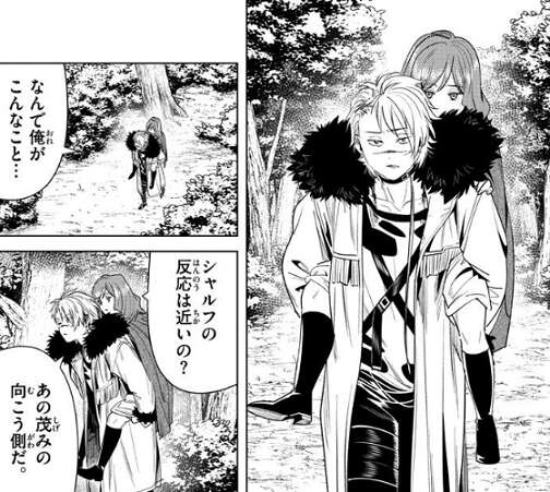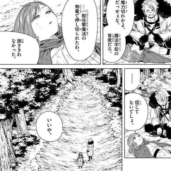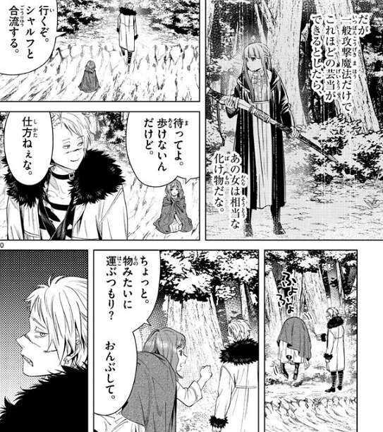 ヴィアベルはフェルンの一般攻撃魔法の痕跡を見て、あの女は相当な化け物だな、とエールが言っていることが本当だと推測します。ヴィアベルはシャルフと合流しようと歩き出しますが、魔力切れのエールは、歩けないんだけど、とヴィアベルに抗議します。
