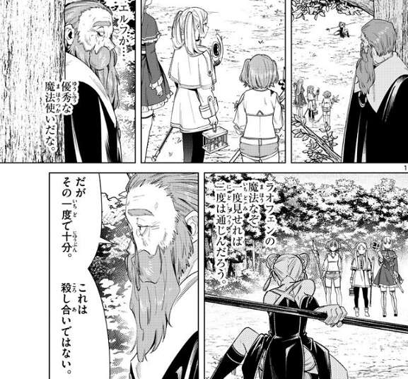 一方、突然現れたラオフェンと対峙しているフリーレン達ですが、デンケンは気付かれないようにその様子を観察しています。デンケンは、ラオフェンの魔法なぞ、一度見せれば二度は通じんだろう、と思いますが、その一度で十分だと言います。